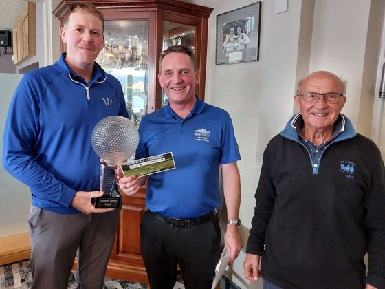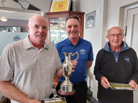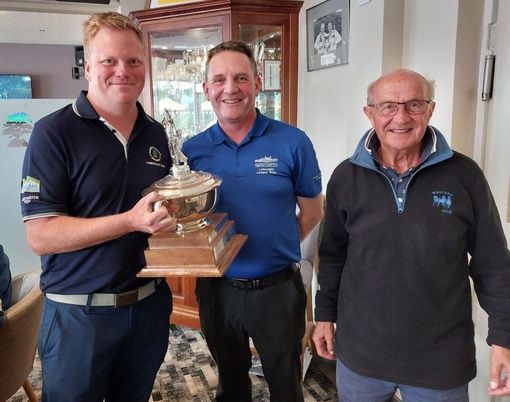 Silverdale's Mark Ainsworth receives the Micklethwaite Masters claret jug from Tony Johnson and Les Micklethwaite.